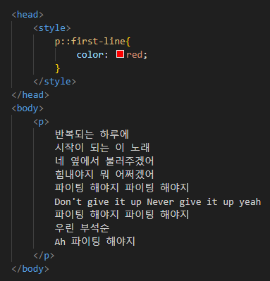 - first-line : 블록 레벨 요소의 첫 번째 선에 스타일 적용.
